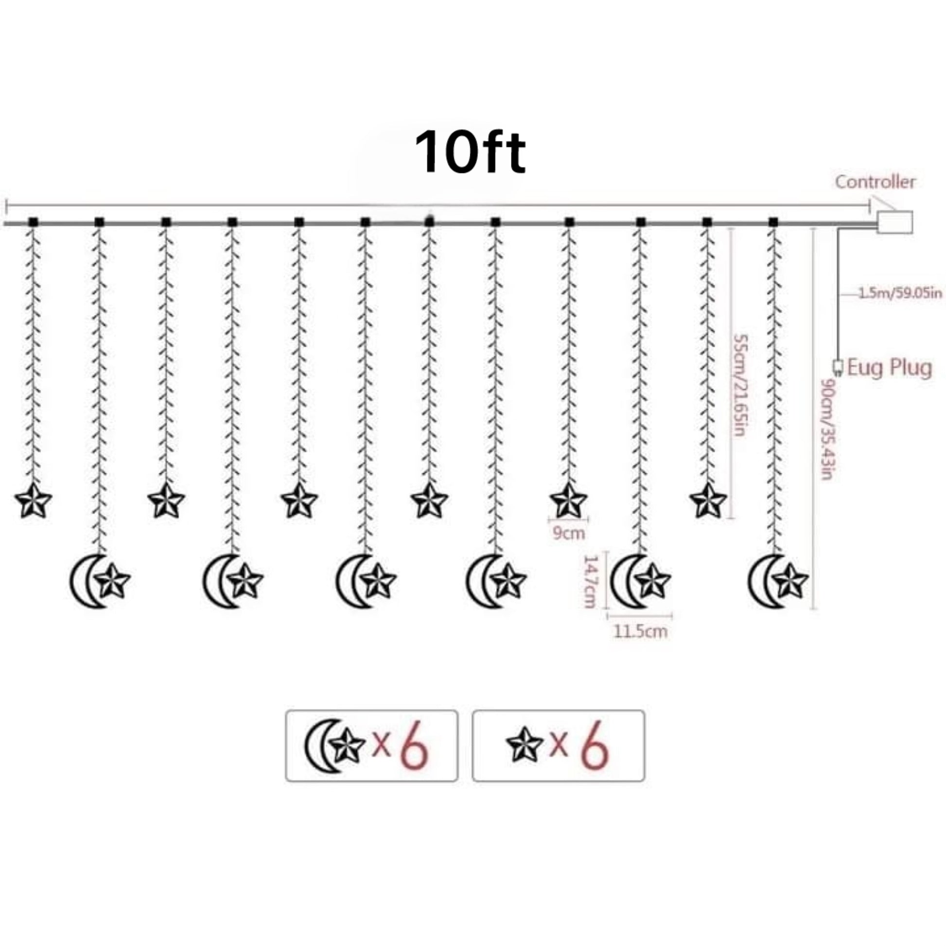 Star and Moon Design= 6 small stars, 3 big stars and 3 moons 10ft lenght and approx 140 leds (electric operated)